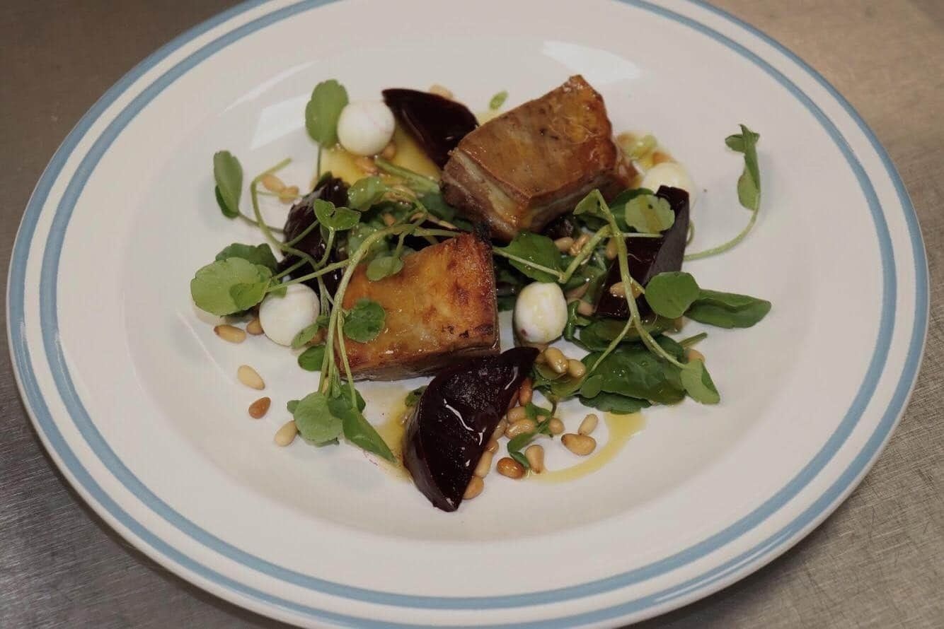 Grilled Goats Cheese, Beetroot Carpaccio, Rocket, Walnuts and Honey Drizzle.