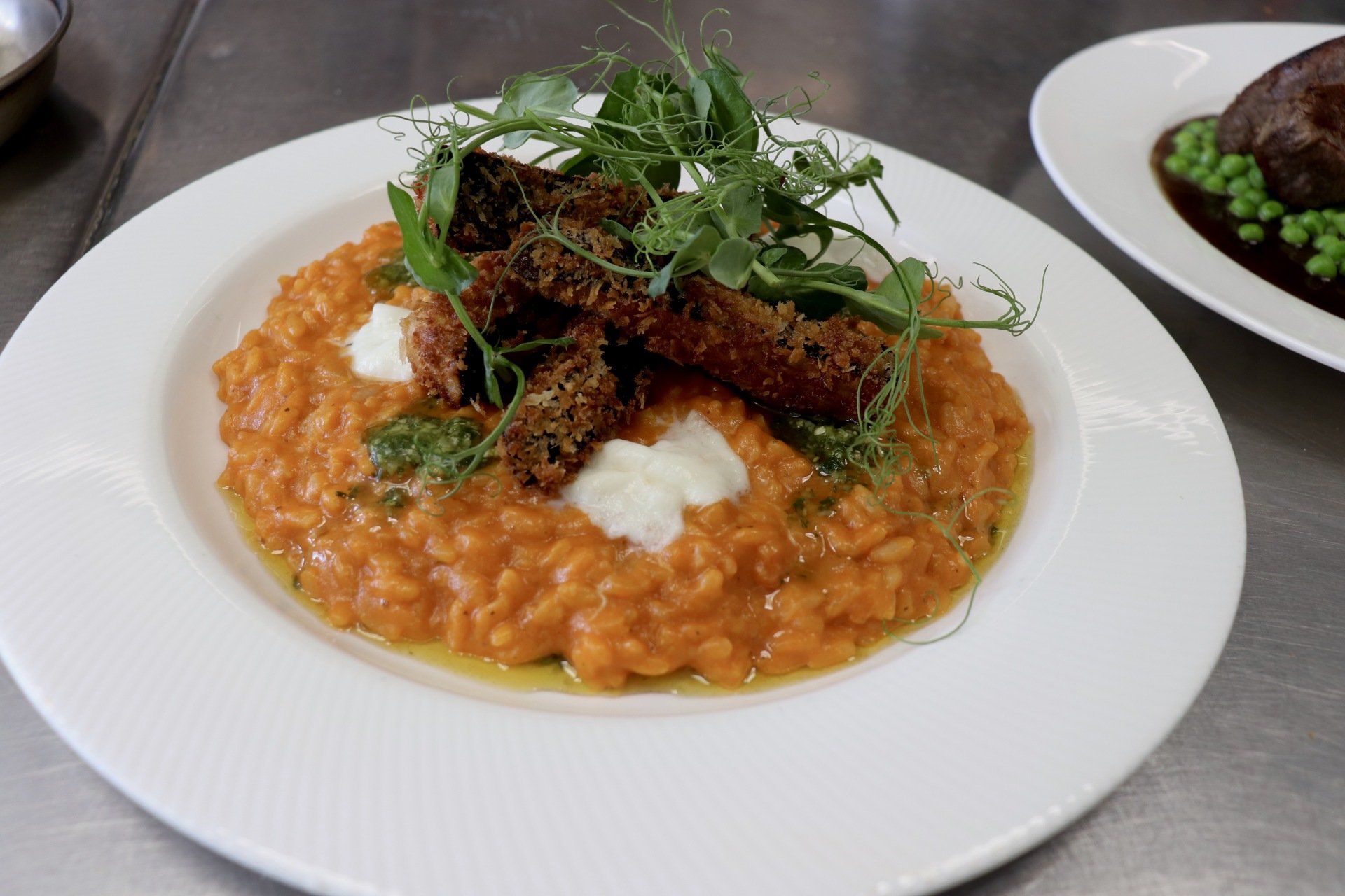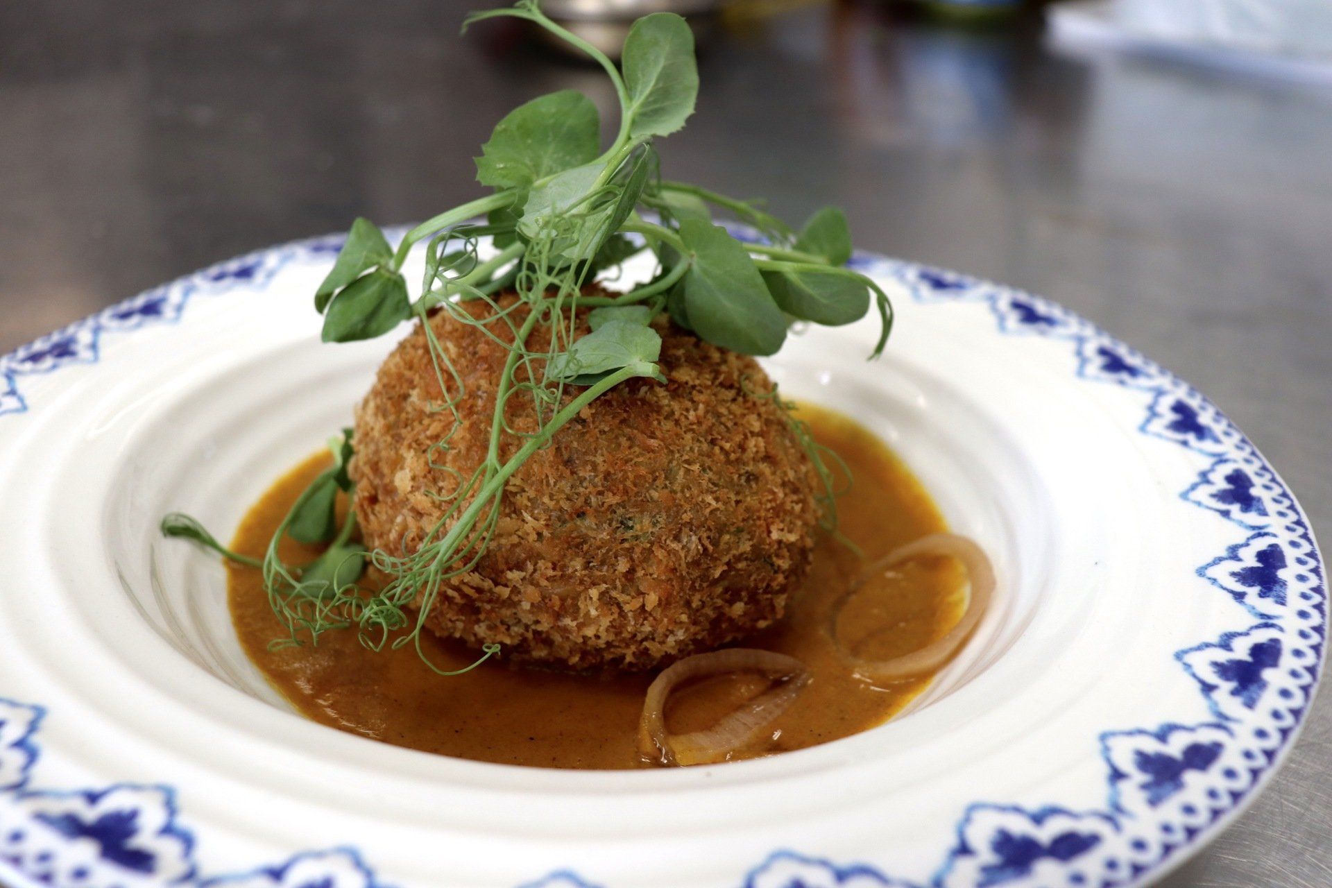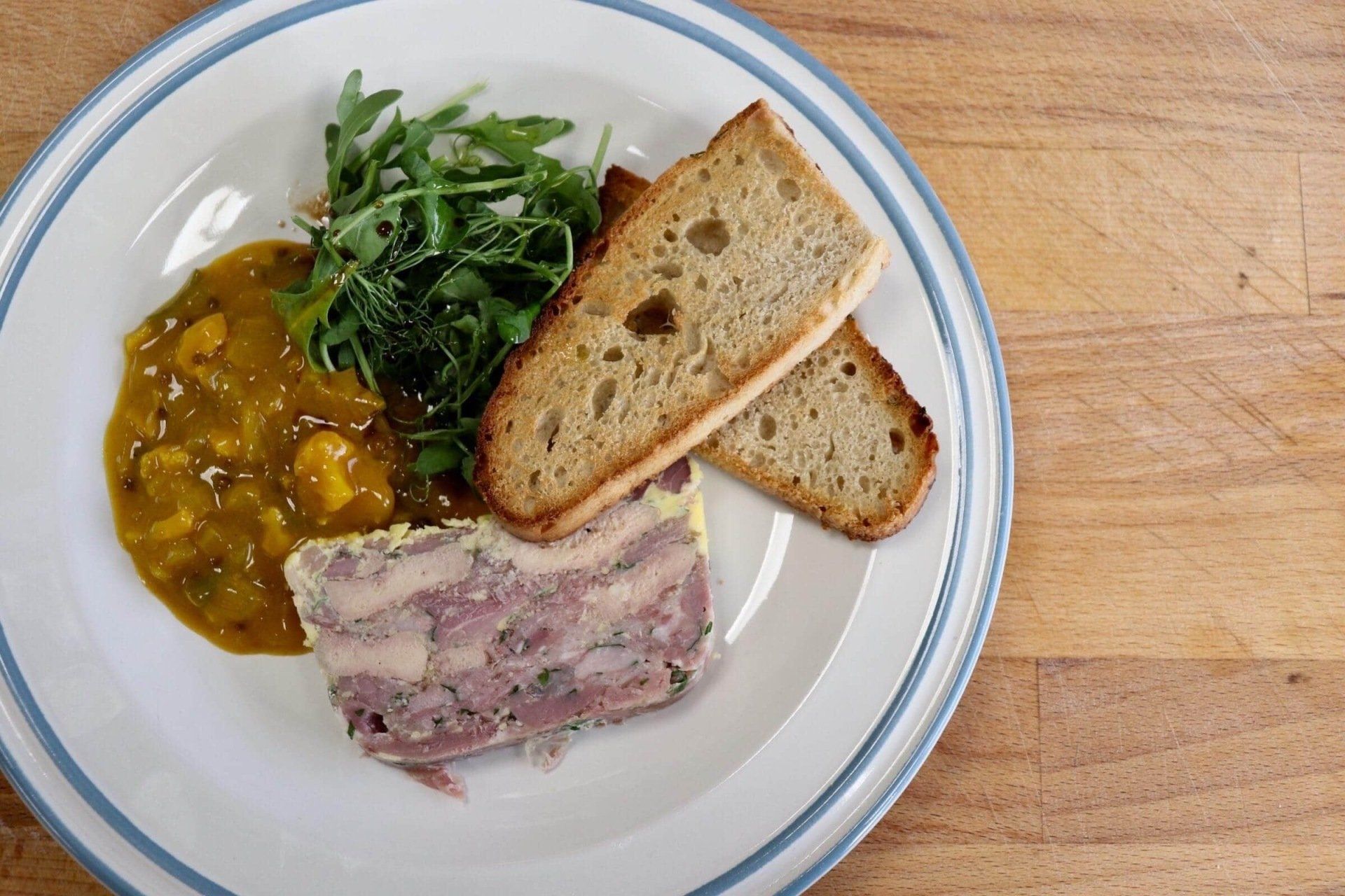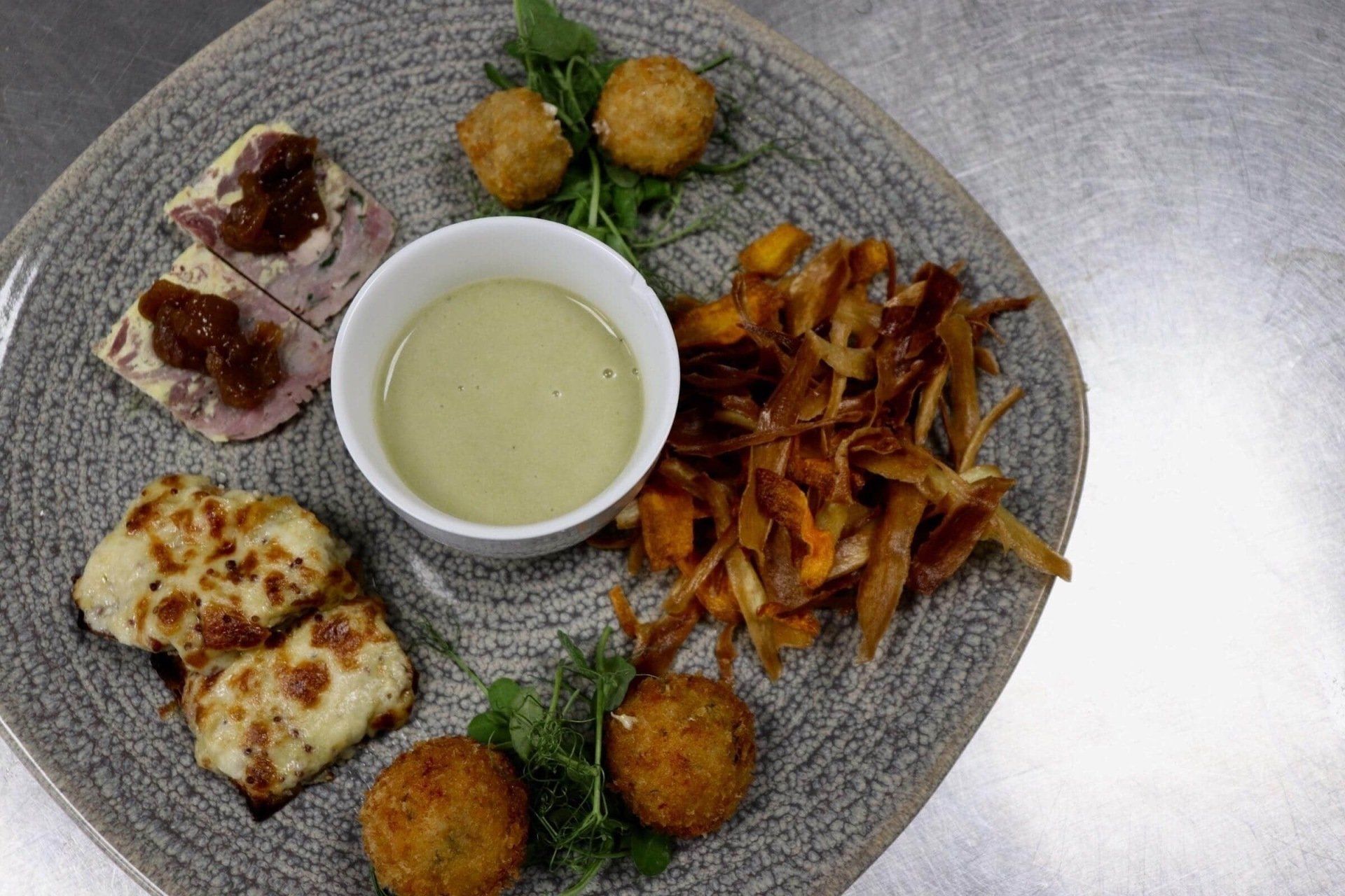 Cauliflower Soup, Warm Cheese Scone, Crispy Seaweed, Game Terrine with Apple and Pear Chutney on Toast & Seafood Arancini